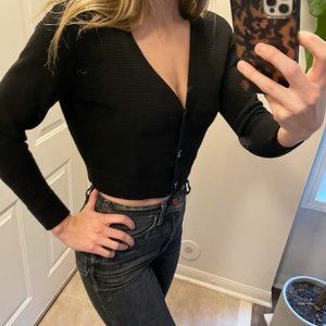 Aritzia Wilfred Light Cropped Cardigan in Black, Size Medium. No visible defects. I find it fits small, as I usually wear a small or xs.