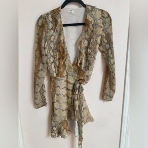 Twirling encouraged. This is a short wrap dress with princess sleeves, a self-tie waist and cascading ruffles at the neckline and hem. It's made with a semi-sheer chiffon. This version of the Louise comes in a custom python print exclusive to the brand.