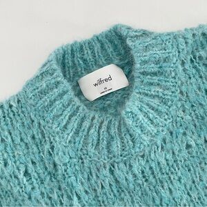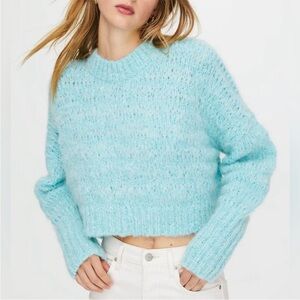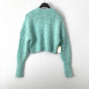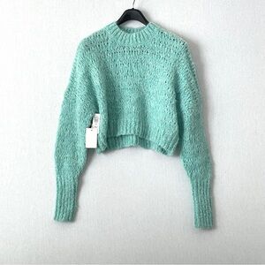 This is a cropped, crew-neck sweater with dropped shoulders and a slight puff sleeve. It's knit with a wool–alpaca blend yarn.