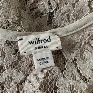 Elevate your wardrobe with this stunning Aritzia Wilfred Madeline Tank Top. This sleeveless lace racerback blouse in size small is the perfect addition to your collection. The delicate lace detailing adds a touch of elegance, while the racerback design gives it a modern and chic edge. Whether you're dressing it up for a night out or keeping it casual for a brunch with friends, this top is versatile and stylish. Made by the renowned brand Aritzia Wilfred, you can trust in the quality and craftsmanship of this piece. This pre-loved blouse is in great condition and ready to be a staple in your closet. Don't miss out on adding this beautiful top to your wardrobe!