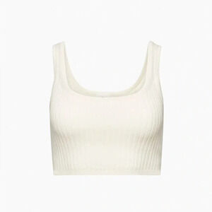 This is a cropped sweater tank with a scoop neckline in the front and back. It’s rib-knit with an extra-fine merino wool-cotton blend that’s lightweight and super soft against your skin.