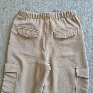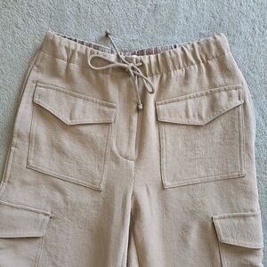 Lightweight, relaxed fit cargo pants made from Crepette fabric, lots of pockets, zip and snap closure with drawstring. In very good used condition. Please note these have been hemmed and no longer have the drawstring at the hem. No size tag, listed as small based on measurements
