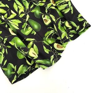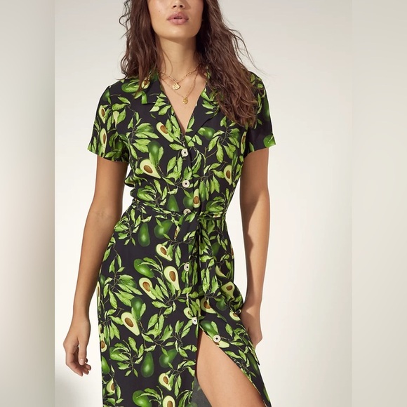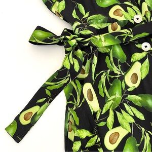 This is a vintage-style, button-front dress inspired by a traditional house dress. It's made from a drapey fabric with a pebbled texture. This version of the Shirt Dress comes in a custom avocado print that was designed in-house.