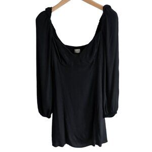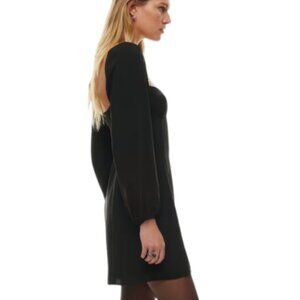 This is a black puff-sleeve mini dress with a sweetheart neckline, a smocked back panel and a thigh slit by Aritizia's Wilfred brand. It’s cut from ReCrepe, lightweight, drapey crepe fabric.
