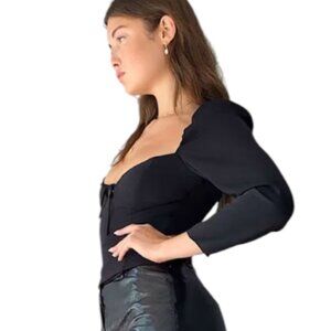 This is a square-neck blouse with puff sleeves, a fitted bodice, and a self-tie at the front by Aritzia's WIlfred brand. It’s made from a drapey, black matte satin fabric.
