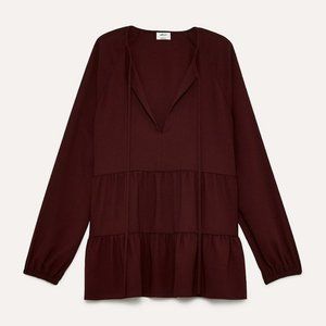 "The Odette is defined by the romantic and feminine details Wilfred is known for. A tiered hem adds subtle volume, and the necktie can be worn loose or tied in a bow. "