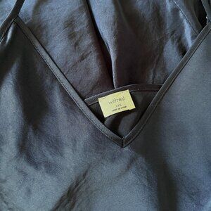 - This is a V-neck slip dress with adjustable straps and a bias cut that follows the curves of the body. It's made from lightweight Japanese satin.