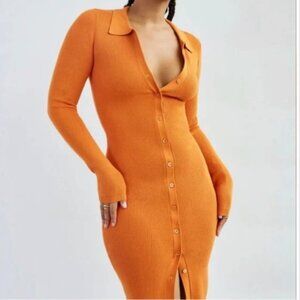 This stylish orange button-up knit dress is perfect for any occasion. Its sleek design and vibrant color make it a standout piece in your wardrobe.