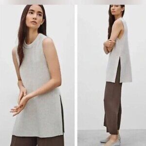 This is a sleeveless, tunic-style sweater with side slits and a crew neckline.
