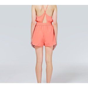 Fashioned in silk crepe de chine, this romper features adjustable spaghetti straps that cross at the back and side trouser-style pockets trimmed with silk georgette at the opening. The elastic waistband is finished with a self-tie drawcord.