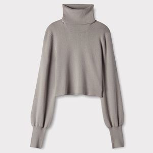 "The crop don't stop 'cause it's chilly out. This is a cropped turtleneck sweater with dropped shoulders and voluminous sleeves. It's knit with an extra- fine merino wool-cotton blend that's lightweight and super soft against your skin."