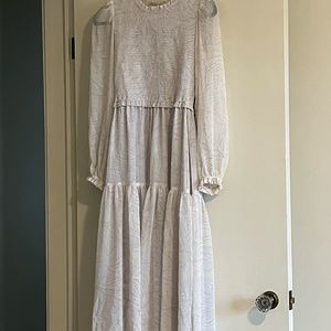 Smocked chiffon material, light beige birch colour. Zip closure on the back. Model in the pics is 5'11", so keep in mind it will hit around mid calf on most folks :)