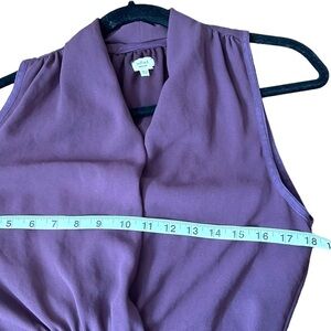 This is a sleeveless dress with a faux-wrap front and self-tie detail at the waist. It's made with a Japanese fabric that drapes nicely.