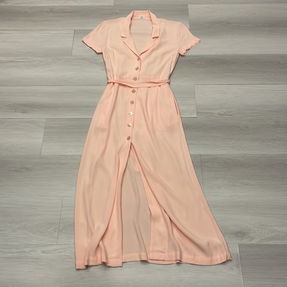 Aritzia Wilfred Shirt dress in coral blush with button up front, removablewaist tie and inseam pockets. Made with a lightweight drapey, pebbled crepe fabric. 53% viscose, 47% rayon. Care tag is missing but dress should be hand washed because this fabric is prone to shrinking. Size Xtra Small. Still currently selling on website in this colour but sold out in almost every size! Good used condition with a few small marks on the front exterior one near the upper left shoulder and two near the bottom left on the skirt portion (photos). I believe they are just marks and not stains and will most likely come out once washed. Please see photos, measurement are for reference only. Reasonable offers welcome!
