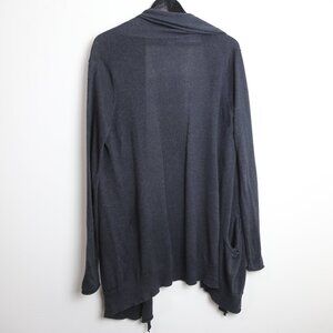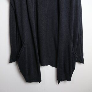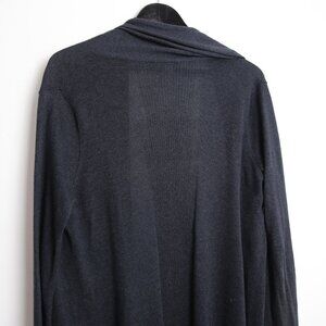 Lightweight and thin. Open front. Long sleeves. Long length and hits below the waist. Ribbed hem. 55% silk, 40% cotton, 5% cashmere. Handwash cold.