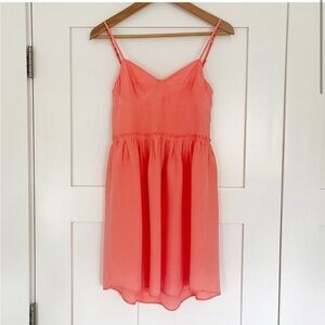 Aritzia Wilfred Silk Dress Aritzia Wilfred mini dress made of 100% silk with a flattering fit and flare silhouette. Gorgeous bright coral colour that pairs perfectly with a summer tan. Details Adjustable spaghetti straps Zipper back closure 100% silk