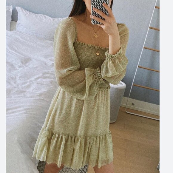 This is a tiered mini dress with a smocked bodice, square neckline and voluminous sleeves