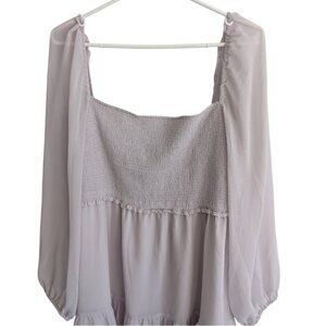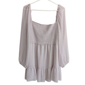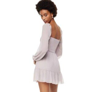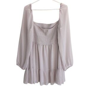 This is a tiered mini dress with a smocked bodice, a square neckline and puff sleeves by Aritzia's Wilfred brand. It's made from sheer lilac grey chiffon with a crepe-like texture.