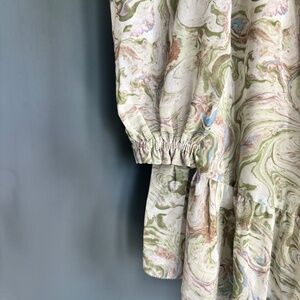 A Wilfred mini dress with an ethereal bohemian vibe. This romantic mini radiates fairy-core charm with its soft marbled print in pale sage green, soft yellow, and baby blue.