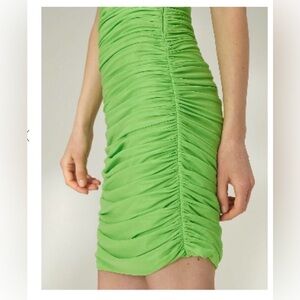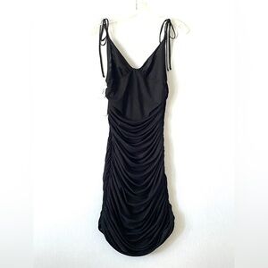 A ruched bodycon dress with a triangle neckline and self-tie straps. It's made with soft, stretchy mesh fabric that hugs the body.