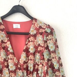 This is a V-neck blouse with long sheer sleeves, a smocked bodice and ruffled edges. It’s made with Fête Chiffon — lightweight, semi-sheer fabric with an ethereal drape. This version comes in an exclusive floral print that was designed in-house.