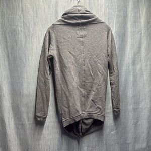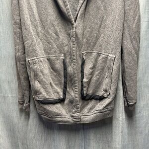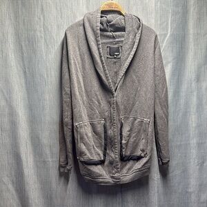 Cozy gray hooded cardigan. Features front pockets. Perfect for layering.
