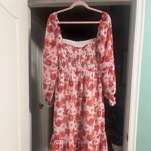 This is a smocked, square-neck midi dress with puffy sleeves, lace trim and ruffled cuffs. It's cut from lightweight, semi-sheer chiffon made with 100% recycled materials. This version comes in a woodblock floral print that was designed in house.