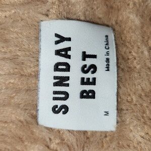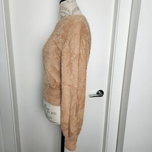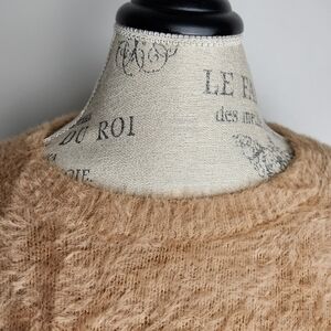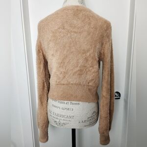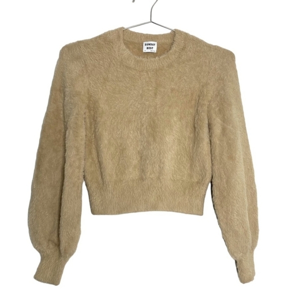 Classic Camel tan brown fluffy Kitten crop long sleeve sweater with ribbed trim, by Sunday Best from Aritzia.
