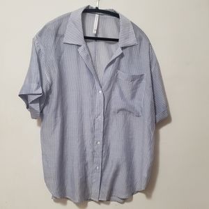 the Group Babaton Withers button up shirt in size large. Features mini pinstripes design and has an oversized fit. This is a relaxed, short- sleeved, button up with a dropped shoulder. Color: Chambray blue.