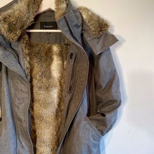Aritzia Babaton Oskar Mid-length Goose-down Parka Jacket in a Heathered Charcoal fabric. Waterproof and windproof fabric engineered to deliver warmth up to -30°C. Merino wool cuffs, 700+ Goose Down Fill and is lined with “luxe vegan fur” made of acrylic & polyester.