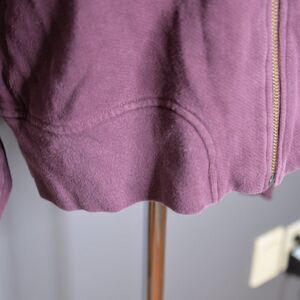 Maroon coloured zip "Brina" sweater/jacket from Aritzia's Wilfred Free line. Features a cropped boxy fit in a bomber jacket style, made from a cozy cotton blend.