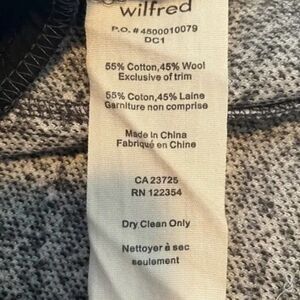 Chic and cozy, this Wilfred mini skirt features a structured silhouette in a dark heather grey tweed with a front full-metal zipper and pockets. The wool blend fabric adds warmth and texture, making it perfect for fall and winter styling. Pairs beautifully with tights, boots, and chunky knits for a timeless cold-weather look.