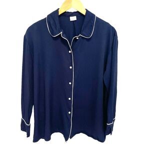 This is a straight-cut, button-up blouse with a Peter Pan collar and piping around the collar, cuffs and placket. It's made with drapey twill fabric.
