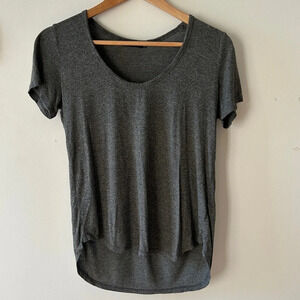 Scoop neckline. Back slightly longer than the front. Heather grey.