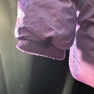 Stylish purple puffer jacket. Features ruffle details. Faux fur hood trim. Warm and cozy design.