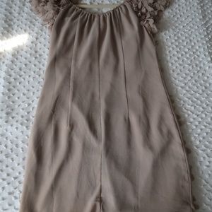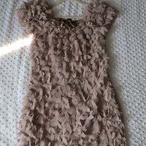 Worn to a summer wedding, this dress is gorgeous on. Frilly in the front, off the shoulder and in a flattering nude tone.