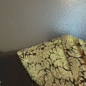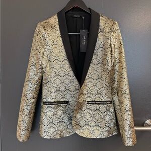 Ark & Co NWT L thicker jacquard style gold metallic blazer (metallic threads) blazer with black lapel. Intricate pattern design. Tuxedo style! So fun and flattering