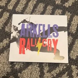Arkells Rally Cry CD with graphic white cover. Bold purple "ARKELLS" and red "RALLY CRY" text with yellow lightning accent. Clean, collectible music album art. Great for fans and displays.