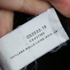V-neckline. Ribbed hem and cuffs. Striped black with dark maroon-brown background. Made of thin knit material. 100% wool. Condition: fabric is slightly worn and pilly, otherwise in good condition.