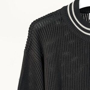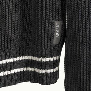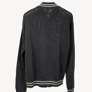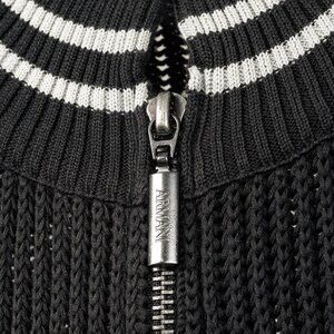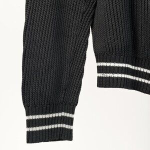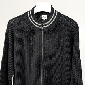 This sweater jacket from Armani Collezioni is crafted in a charcoal grey cotton knit, and is accented with light grey stripes on the hems. It features long sleeves with ribbed cuffs, a ribbed high neck, a front zip closure, and a ribbed banded hem.
