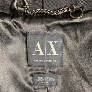 Step into style with this sleek Armani Exchange women’s jacket, which blends modern edge with classic structure, featuring a high funnel collar with snap and buckle details for a bold, fashion-forward look. The lightweight black outer shell offers a smooth, refined finish with a subtle shimmer for a refined, eye-catching finish. The asymmetrical zip and multiple zippered pockets add both style and practicality. A tailored silhouette and pleated back give the coat a flattering, feminine shape, making it perfect for everyday wear or elevated casual outfits. Stylish, versatile, and unmistakably A|X, this jacket is a standout piece for any wardrobe. Belt not included.