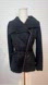 Features of the jacket include; gun metal tone hardware, belt, asymmetrical design, large collar, open slip pockets one to each side, faux leather fabric, fabric has a slight stretch to it and fully lined.