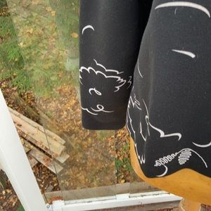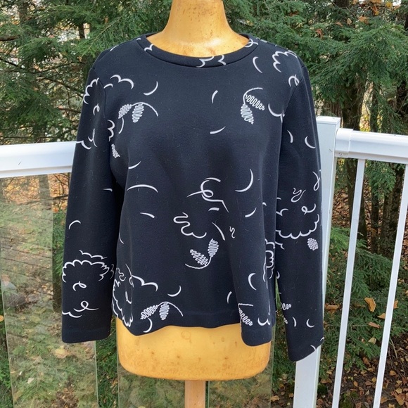 Stylish black top with white abstract patterns. Long sleeves. Crew neckline. Perfect for casual wear.