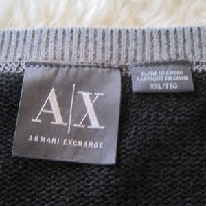 Armani Exchange men's sweater. Colour: Heather Grey/Black. SIZE: XXL. (armpit to armpit measures 23.25") Sweater has a pullover design with a v-neck. Featuring an oversized A/X logo in the front. Exposed stitching, ribbed neck, cuffs and hem. Authenticity card. Fabric Content: 100% Cotton. Sweater is new and has not been worn.