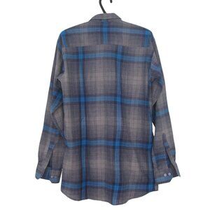 Armani Jeans grey and blue button up shirt size 42 neck 17. The material tag is missing but it feels like lightweight cotton. It has minor wash wear, and the top button is missing (see picture). Ptp 21".