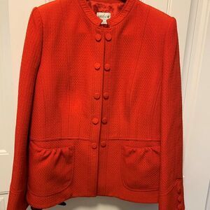 Armani Collectioni hot chili pepper red jacket in excellent used condition with no wear, stains or damage detected. 63% wool for comfortable, breathable wear. Appreciate all the details authentic Armani is famous for. Fully lined, interesting pique type fabric, working snap closures on front and cuffs, nehru collar, fabric covered buttons, multi darted to ensure trim, curve hugging fit, softly gathered front patch pockets add charm and femininity. Italian size 50 compares to Canadian large. See photos for measurements and check on line size charts for conversions to ensure fit. Jackets in 2023 Armani on line spring collection currently listed at $3500.00 so go ahead, spoil yourself, impress your friends, land that exec interview with this dress-to-impress, investment piece from Armani, at a fraction of the cost. Add a few sophisticated, upscale finishing pieces from Our Closet (some suggestions shown all listed and priced separately, lots more options available). This is how to get Fresh with Lemon Squeezy Shop 🍋