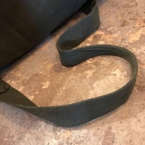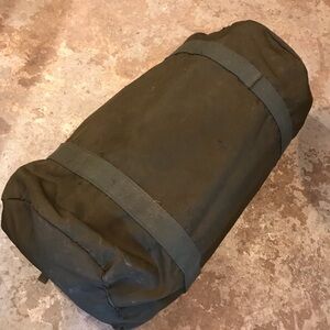 Durable and spacious, large capacity army green Canadian Military ballistic nylon duffel bag. Features sturdy wide shoulder straps. Zip as well as button flap closure. Ties to keep handles together. Name identification pocket. End pull for ease of removal from trunk, tent, etc. Folds up small for storage/ shipping. Used military condition - soldier’s name on item. Perfect for travel, camping, or gym use.