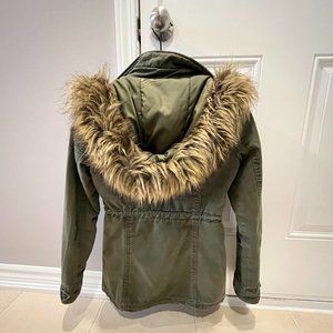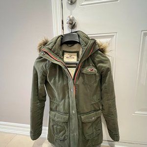 Women's HOLLISTER army green coat with sherpa lining and fur hood in size XS. Used but in good condition Comes from smoke-free/pet-free home and owner.