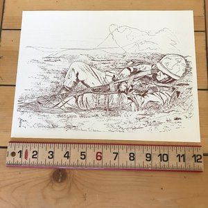 Sepia toned art print on textured paper shows a landed paratrooper. Artist name (CP Cook) in left corner. 9" tall x 12" long. Pre-owned paper print has some wear along edges/corners.