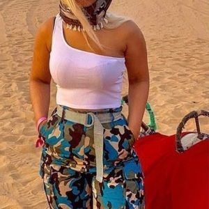 Very nice original pants Army pattern with belt to match. No flaws, adjusts to the level of the feet for a more cinched effect.
